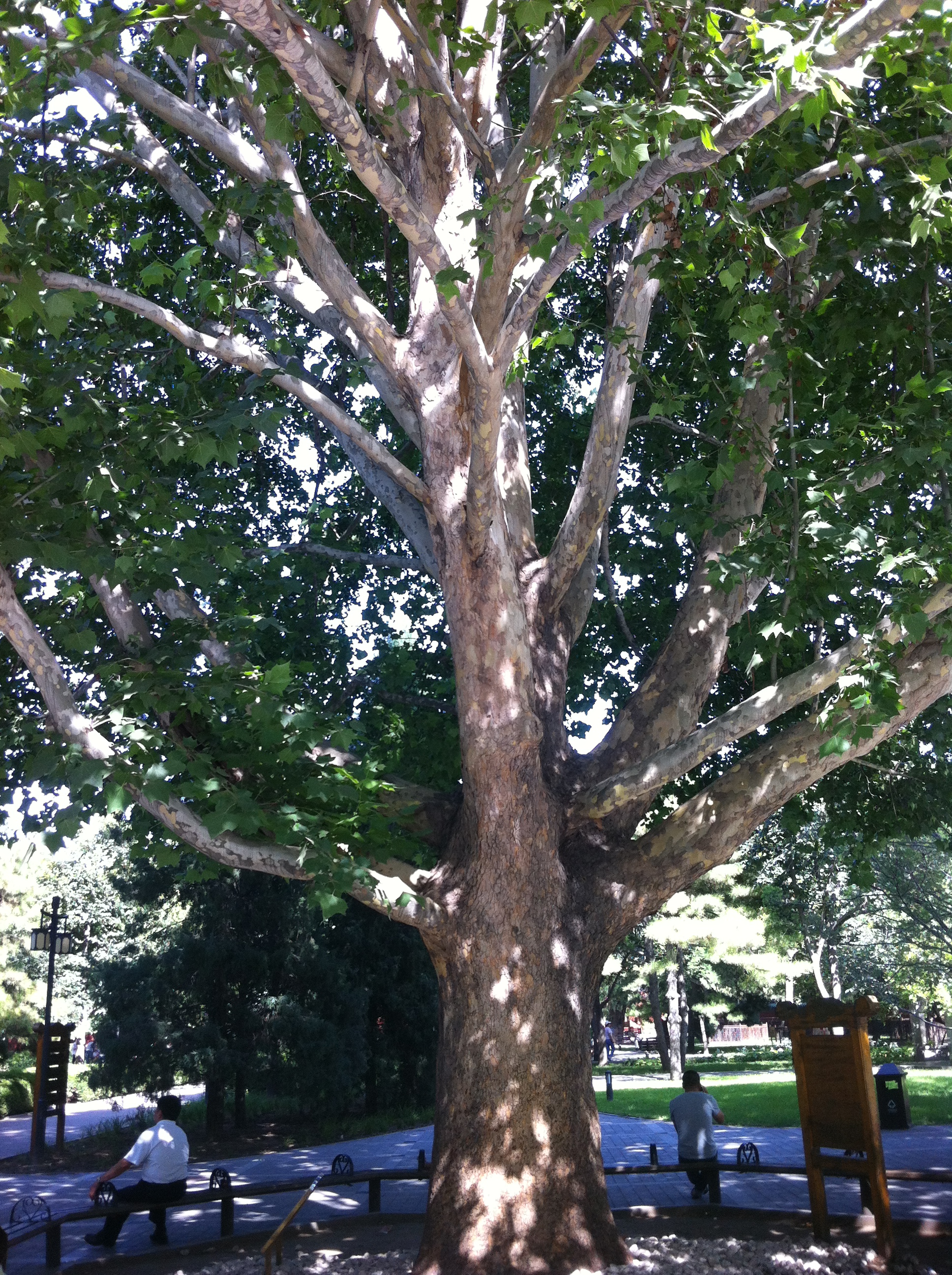 I remembered that glorious moment of discovery yesterday when, visiting Ritan Park in Beijing on a beautiful day with a blue and – that rarest of things in this city – clear sky, we found ourselves sitting in the shade of a lovely plane tree. It was not as majestic as the specimens we had discovered in Spain, but it was still arresting. It had been manicured so that it grew more regularly in all directions, and a bench had been arranged around it in a wide circle.