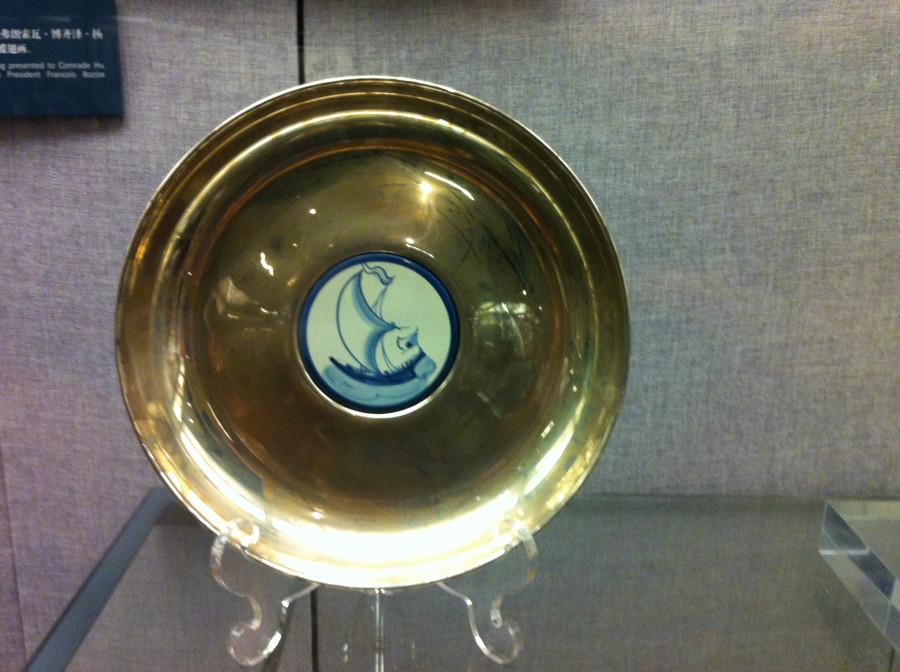 while from Portugal came this gift from Prime Minister Jose Socrates to Hu Jintao of a silver plate with a lovely azulejo-inset of a boat in full sail