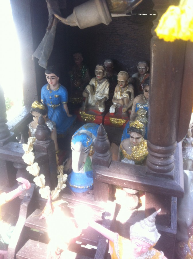 And if, finally rendered curious by constantly coming across them, one decides to have a closer look, you will find that they hold little figurines – old people, dancers, horses, elephants, cars, sometimes a Buddha. This, for instance, is a catalogue of what the bigger of our apartment block’s two little houses contains.