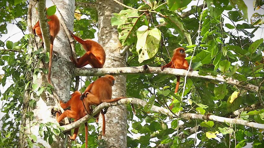 Red leaf monkeys: http://il2.picdn.net/shutterstock/videos/5039030/thumb/1.jpg?i10c=img.resize(height:160) (in http://www.shutterstock.com/video/clip-5038946-stock-footage-rare-red-or-maroon-leaf-monkey-presbytis-rubicunda-in-the-jungles-of-borneo-this-is-a-beautiful.html)