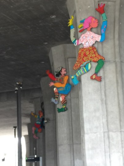 Art livening up the otherwise dreary underbelly of a highway overpass, seen at a subway transfer station after leaving Watts.