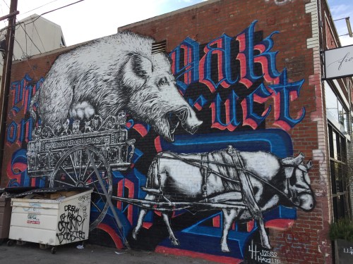 Art livening up the otherwise dreary underbelly of a highway overpass, seen at a subway transfer station after leaving Watts.