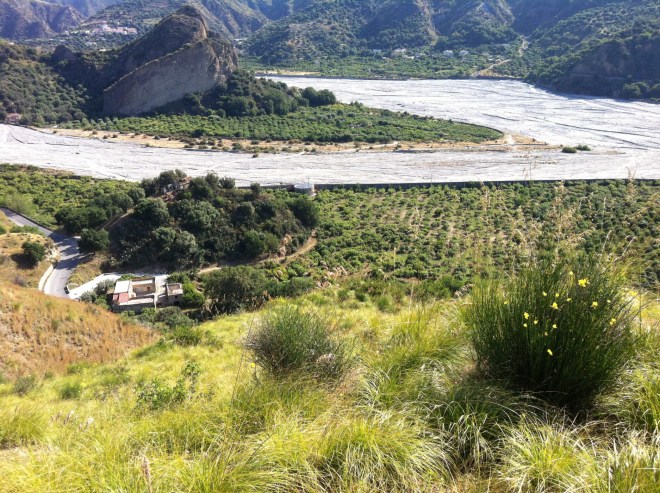 90% of the bergamot trees grown commercially in the world are to be found in one small corner of southern Italy, in the ball of Italy’s foot to be precise: in the communes of Brancaleone, Bruzzano Zeffirio and Staiti in the province of Reggio Calabria. Here is a photo of one of the bergamot orchards in Brancaleone, down along the banks of a very dry river bed.