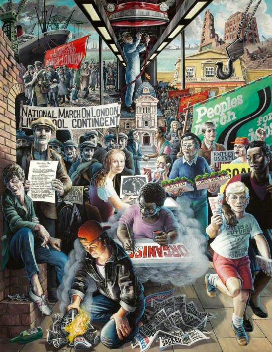 While this painting from 1993 (also used in a past post) comments on the lack of work affecting all ethnicities.