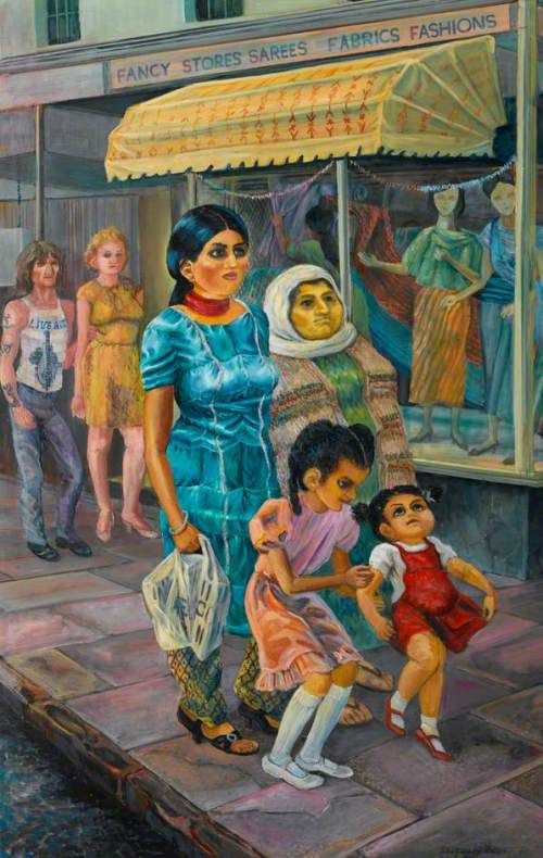 It is a scene showing equality among the painting’s participants – although perhaps the artist, in having the adults in the South Asian family wearing traditional dress and the children in “British” dress, is making a point about integration? I certainly see integration as the issue in this next, undated, painting by the same artist.