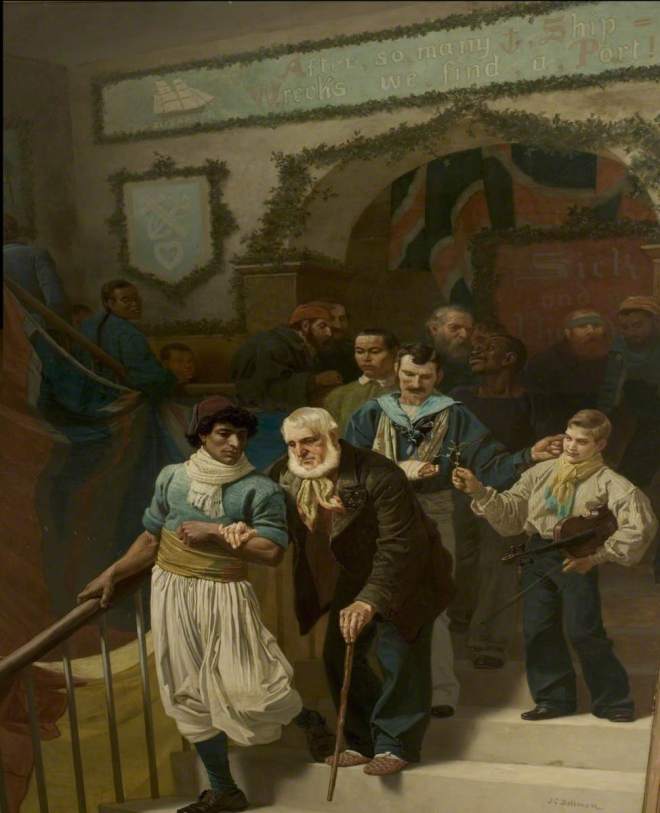 Dollman, John Charles; Friends in Adversity, Christmas Day at the Dreadnought Hospital, Greenwich (Coming Down to Dinner); Nottingham City Museums and Galleries; http://www.artuk.org/artworks/friends-in-adversity-christmas-day-at-the-dreadnought-hospital-greenwich-coming-down-to-dinner-46899