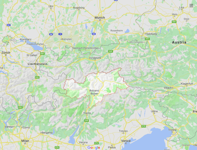 Italians call it Alto Adige but many of its inhabitants call it South Tyrol, it having been part of the County of Tyrol since time immemorial; it was only prised away from the Austro-Hungarian Empire and given to Italy after the former collapsed at the end of the First World War. Over the last hundred years this fateful decision has led to much agitation, repression by the Italian State, and consequent acts of terrorism, although all the brouhaha has pretty much died down by now.