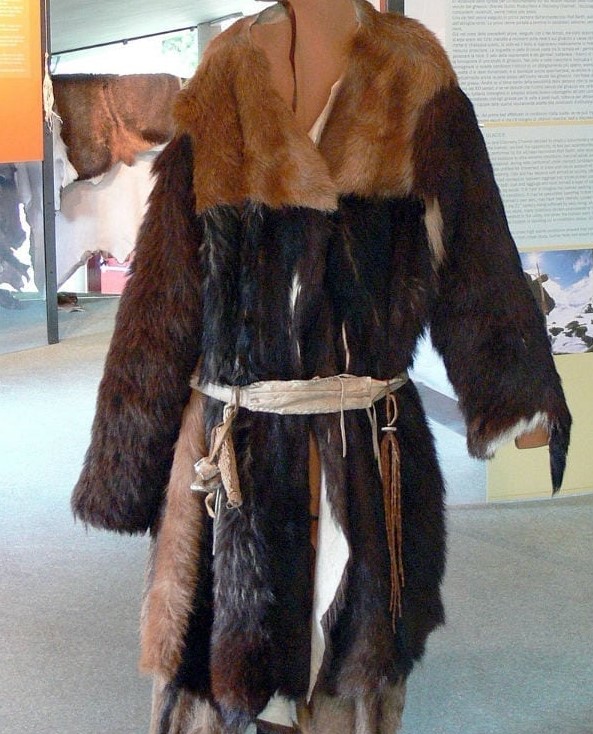 It’s not just the man who has been thoroughly investigated, it’s also his clothes and equipment. What mainly transpires for me was that in today’s language, Ötzi was a completely sustainable guy. He relied heavily on animal hides for all his needs; scientists have identified bear skin, deer skin, goat skin. These were used not only for his clothes but also parts of his equipment (fascinating factoid: at least one of the hides which he used was tanned with bear brains and fat; better than the human carcinogen Chromium VI which is almost universally used nowadays). Animal sinews were used to sew the pieces of hide together (I’m no expert on sewing, but for those who are interested there are sites, e.g., this one, which explain the kind of sewing that was used). Grasses of various kinds were used to both make twine and as a thermal stuffing. Here is a close-up of the reconstituted leggings and shoes on the statue of Ötzi