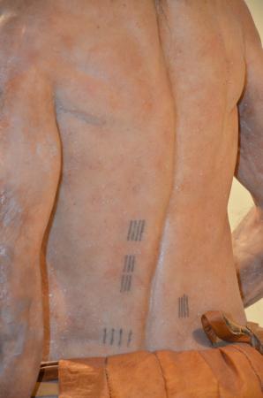 A few words about what we would have noticed about Ötzi if we had met him 5,000 years ago just before he died. He was about 160 cm (5 ft 3 in) tall (small by today’s standards, perhaps big by the standards of the day). His shoe size would have been an EU 38 (I will let readers translate that into whatever shoe size system they are familiar with; they can use this site, for instance, to do this). He weighed about 50 kilos (110 lbs), nicely within his BMI. He had brown eyes. He had dark hair. He was gap-toothed. His teeth in general were not in particularly good condition, badly worn down and with cavities (probably due to a diet based on heavily processed grains). As to his age when he died: about 45 – young by today’s standards, old by the standards of his time; the makers of the statue have made him look weatherbeaten, which he probably was. And he was tattooed; in all, he carried 61 tattoos on his body! This photo of the rear of the statue shows where he had some of them on his back.