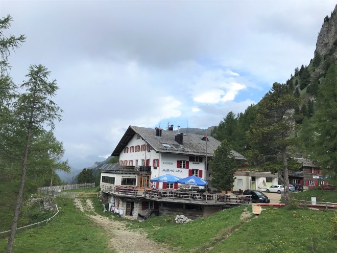 We stopped for lunch in the Mountain hut ” Passo Principe” (not our photo – source). Braver souls were climbing higher but there was too much snow for us.