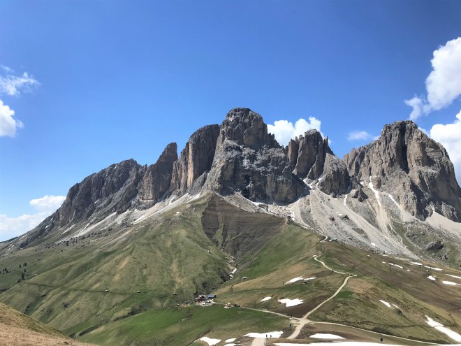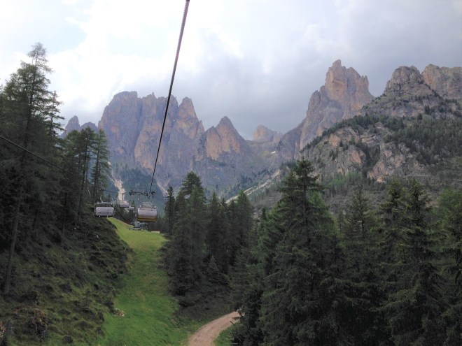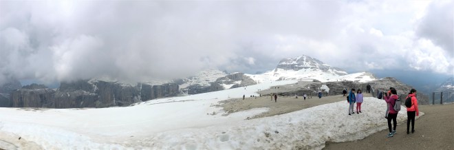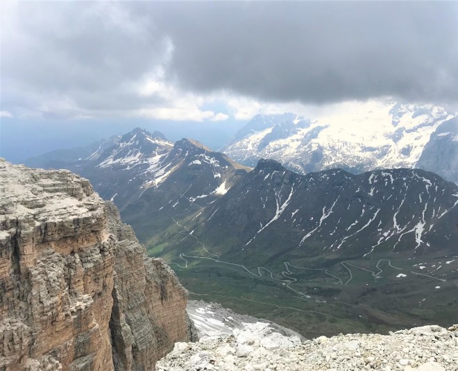 We’ll be going (by cablecar) to that black dot on the edge of the mountain range straight ahead – the Sass Pordoi
