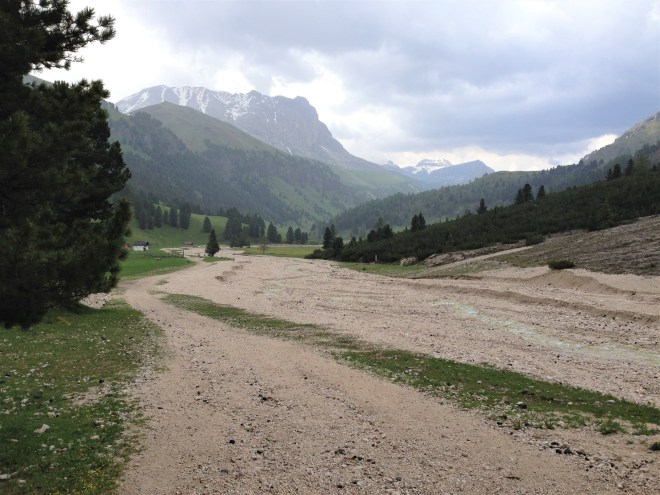 Dark clouds have suddenly swept in. It’s hailing! Down below is the valley, the Val Duron, we will eventually be walking down.