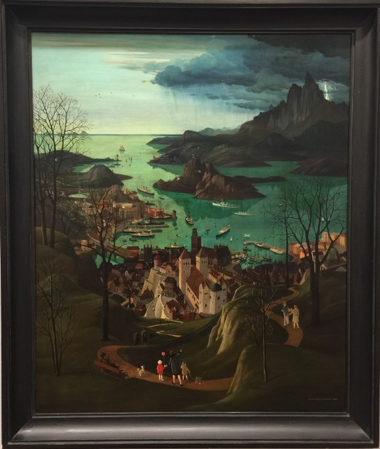 The exhibition had a number of examples of Austrian painters who adhered to the New Objectivity movement which sprang up after World War I, as a reaction to Expressionism. One strand of New Objectivity was a return to classicism. After the horrors of the war, throughout Europe there was a “return to order” in the arts, which resulted in a turn away from abstraction by many artists towards neoclassicism. I include here one example from the exhibition, The Big Port of 1928 by Herbert von Reyel-Hanisch.