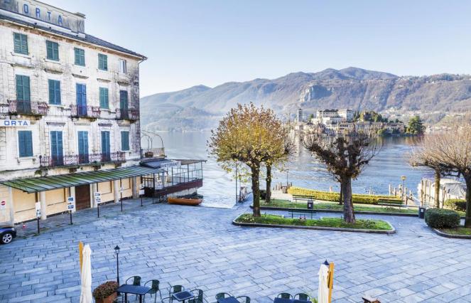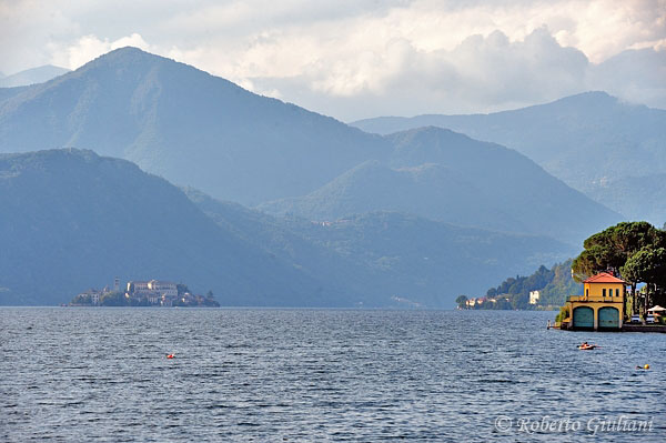 Isola San Giulio is visible, along with a few houses of Orta San Giulio to the right. The pre-Alps rise up in the background.