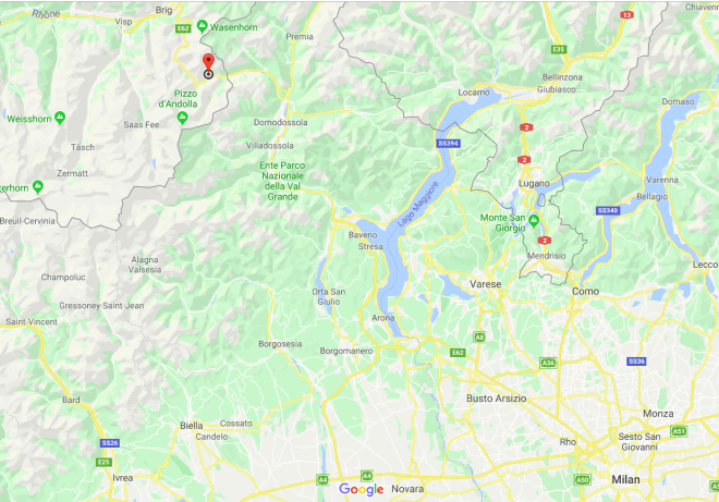 The island’s religious vocation was always in conflict with its obvious military importance. As this map shows, Lake Orta was one of two natural passageways for anyone crossing the Alps at the Simplon Pass to get down into the Po River plain and all its riches – the other was along the shores of Lake Maggiore. The red pin shows the location of the Simplon Pass in the map.