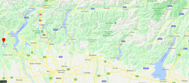 That end point was the village of Orta San Giulio, which sits on a peninsula jutting out into Lake Orta. This is a small lake, the most westward of that series of lakes which form a necklace at the base of the Alps, between Verona to the east and Novara to the west. Readers with good eyes will see Lake Orta, marked with a red pin, to the far left on the map below.