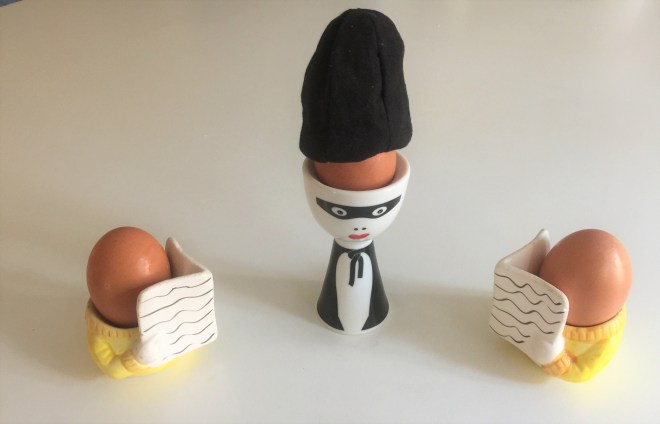 The worst of it is that I have written so little on this blog. I have been cut off from the outside world, which has nearly always been the source of my inspiration. (It’s true that I’ve also been sick; we’ve been debating ever since what I got: Covid-19 or just an ordinary flu? I was very asymptomatic – no fever, no cough – so I plump for the latter, but we will have to wait for a confirmatory test some time in the future when there are enough tests to go around). For the last three weeks, we have been forced to turn inwards, wandering from room to room in the apartment. This photo, which was emailed to me by an old colleague and is no doubt doing the rounds on social media, captures the feeling well. Well, I’ve finally decided to make the best of a bad job. If I can’t go outside, I shall look for inspiration for this blog in our apartment, and more specifically in all the knick-knacks which my wife and I have collected over our years together, as well as those which we inherited from my mother-in-law, a great collector of knick-knacks. I will start with our little collection of … egg cups.