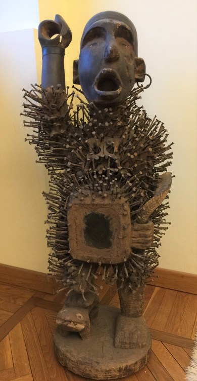 As I said, he is big: a little over a metre tall. My wife bought it at an auction of African art at the Dorotheum auction house in Vienna. The blurb we received at the time of sale states: “Nail fetish, tribe: Bakongo, Democratic Republic of Congo, wood, on a plinth, one foot set on a small animal as an expression of power, right hand lifted and holding a spear to defend from evil influences [the spear has disappeared], large oversized head with a wide-open mouth and all-seeing glass eyes, body covered all around with nails and iron pieces, with a glass-locked belly box filled with magic substances giving the figure power, suspended amulets, dark patina, age damage, 2nd half of 20th Century”.