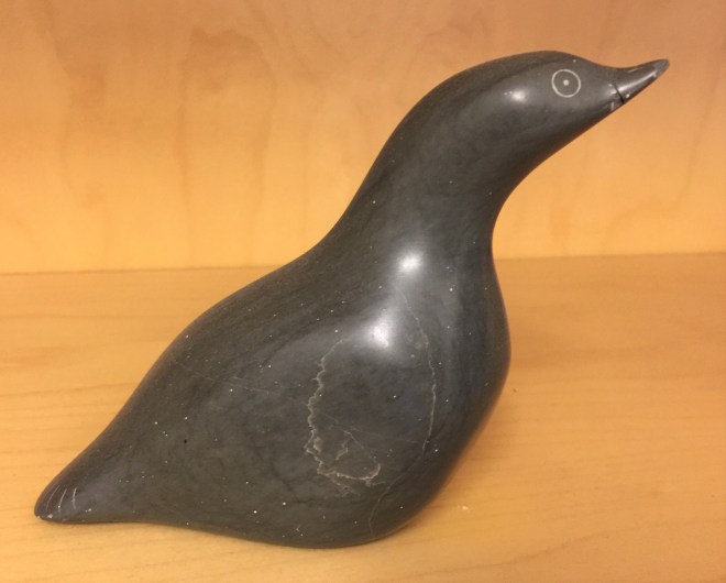 It is a loon, a common bird on the lakes of North America, and one with a wonderfully haunting cry. I remember it vividly from my little canoe trip on Lake of the Woods (which I wrote about in an earlier post). It was made by an Inuit artist, although which one I don’t know. Because of this Arctic connection, I insert here a photo of an Arctic loon.