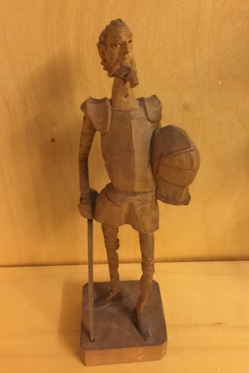 I’m guessing that it’s Don Quixote. I find the caricature rather well done: a noble-looking head above, thin bandy legs below. Some 15 years ago, my wife and I visited Burgos during a tour of Spain. I was astonished to see a shop offering pretty much identical pieces as this one, in all sizes. My wife reckoned that our piece must have been brought back from Spain by her father. She had a memory of him going to Burgos for a conference. I was suddenly assailed by a sense of his ghost walking down the road ahead of us.