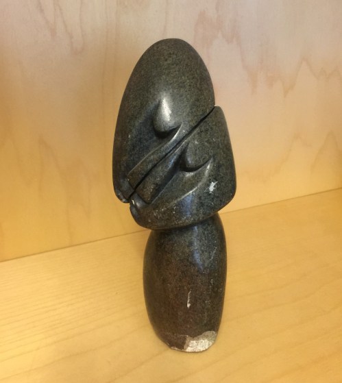 I went there with my wife (who was then still my girlfriend) during the summer of 1977. It was she who spotted the piece in a shop close to the National Art Gallery in Ottawa which sold Inuit art, called the Snow Goose. The blurb we were given at the time of purchase gave its title as Face Spirit and stated that it was handmade by an Inuit artist called Sharky who lived in Cape Dorset in Canada’s far north. When we brought it back, my mother-in-law fell in love with it. Since we were both going on to graduate school that Autumn and therefore by definition would be “of no fixed abode”, living in cheap, rented accommodation, we were happy to give it to her on a long-term loan. We took back possession of it some 15 years later when our life was finally on a more even keel. Some 15 years after that, when I was in Montreal for a conference, I spotted a gallery which sold Inuit pieces and visited it. The pieces were all quite modern. When I said that I had bought a piece of Inuit art back in 1977, the lady exclaimed, “Oh, you have an antique!” Readers can imagine how that made me feel about myself.