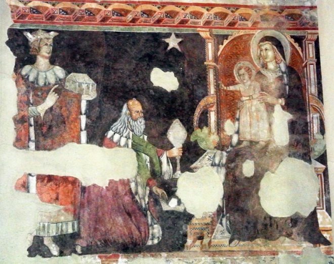 For such a little church, it was quite a treat. Before we even went inside, there were three funerary monuments, dating from the 13th and 14th Centuries, to inspect. Readers can see two of them in the photo above. As for the interior of the church, there were some charming frescoes from the 14th Centuries on both walls of the nave. I particularly liked this Adoration of the Wise Men.