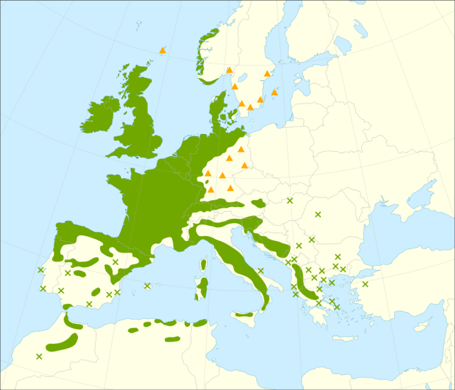Presumably, as the legions marched outwards from the Roman heartlands they took with them their Saturnalia festival. Holly (at least the species which grows around Rome) is present in just about all the European regions and some of the North African regions which the Romans conquered (the green crosses mean isolated populations, and the orange triangles indicate places where the holly was introduced and became naturalized).