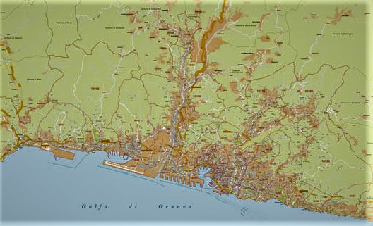 But in the late 19th-early 20th Century, Genova, which we see in the far distance in this poster, was spreading like a cancer along the coast and up the valleys behind it – it was the only way the city could expand in this region where the steep hills drop precipitously into the sea. To show what I mean, here is a map of what Genova looks like today. It’s expanded up and down the coast, swallowing up places like Pegli, and sent tendrils of urbanisation up into the valleys behind.