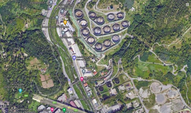 The presence of oil tanks there are the consequence of another decision, taken in the early 1960s, to have Genova’s oil terminal built close to the airport (so another pleasant sight from the gardens must no doubt be the periodic arrival of oil tankers coming in to offload their cargo). The oil pipelines snake over the hills from the terminal to these tanks, where the oil is stored prior to further onward delivery to the north of Italy.