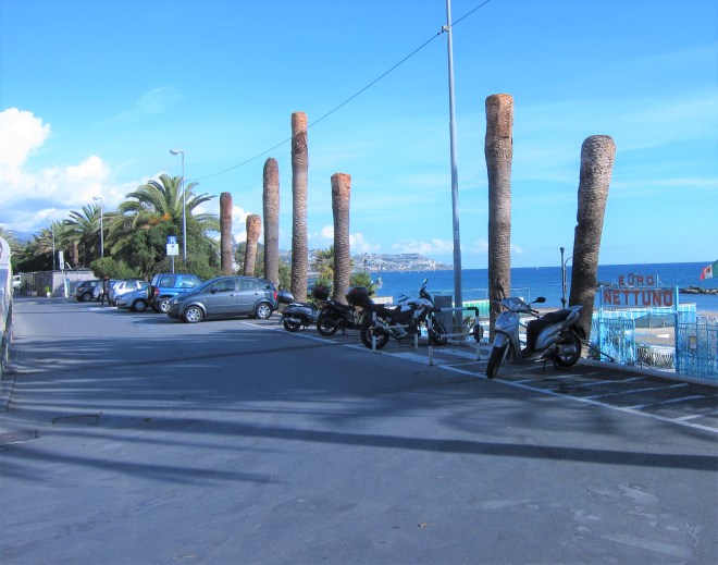 Now, the fact is that in the last year or so during our walks and hikes in Liguria we have been noticing many dead palm trees, either with their fronds dried up and drooping piteously, or with the fronds completely amputated leaving behind a forlorn blackened trunk.