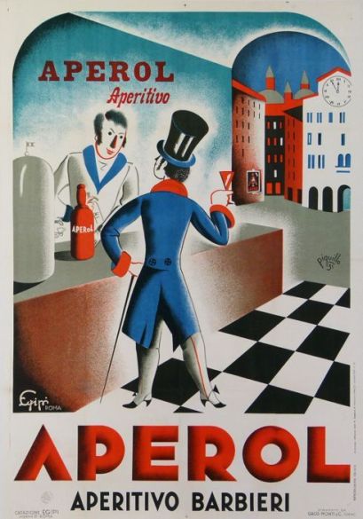 In parallel, the Barbieri (by now, the next generation had taken over) aggressively pushed Aperol as the bitter of choice for the new-type spritz. Here are some examples of the advertising posters they used to promote the Aperol Spritz.