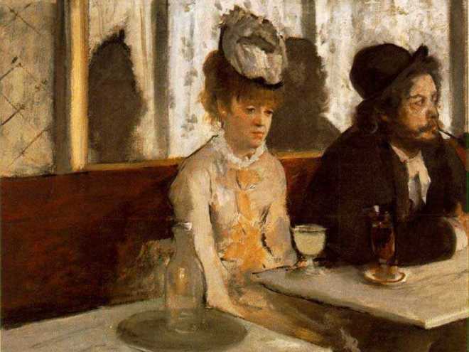 This happy lady appears to be drinking a traditional beer, but a new drink also made its appearance at this time: the apéritif . This apéritif was actually a retooling of a drink originally invented in the Middle Ages as a medicinal product, something to open your body up and let the bad vapours and whatnot escape (aperire being the Latin for “to open”). It was made by steeping and macerating various herbs and roots in wine (first) and alcohol (later). By the time the café culture along Paris’s boulevards came along, the apéritif had lost its medicinal connotations and was promoted instead as something to take before a meal to “open up” your appetite. We have a painting here by Degas of this new custom.