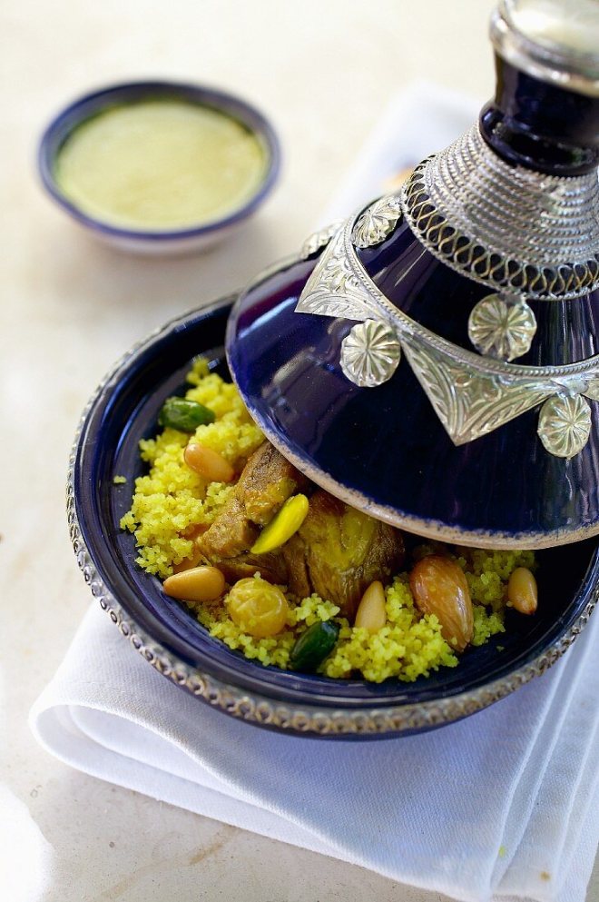 Previous ImageNext Image Lamm-Tajine mit Pistazien, Pinienkernen, Kurkuma und Rosinen (Tunesien) Source