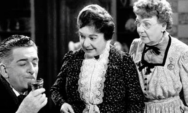 This gentility is given a sinister twist in the hilarious film Arsenic and Old Lace of 1944 starring Cary Grant. SPOILER ALERT!! SPOILER ALERT!! Cary Grant’s character, Mortimer Brewster, discovers that his two spinster aunts, Abby and Martha, who are really lovely old dears, have taken to murdering lonely old men by poisoning them with a glass of home-made elderberry wine laced with arsenic, strychnine, and “just a pinch” of cyanide.