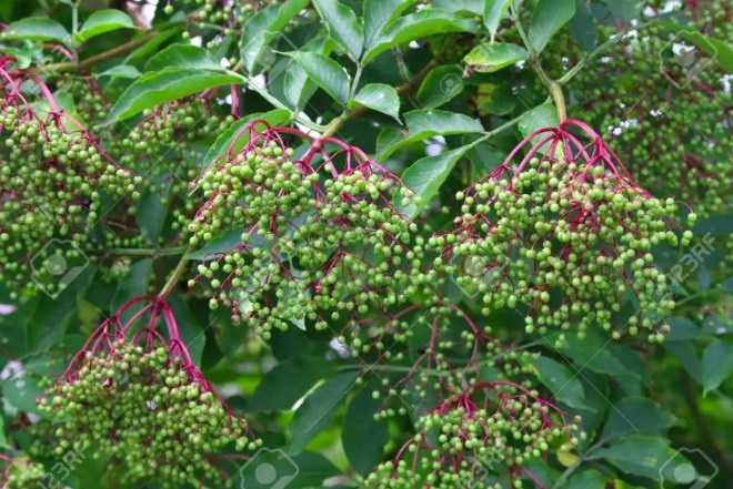 To while away the time and keep my mind on other things, I’ve decided to start a new post. The topic for this one is the elder tree. I was inspired to write it by the sighting I had on a recent hike with my wife in the woods around Vienna. It was of a branch of an elder tree hanging over the path, rich with berries – still green, but full of promise for the autumn.