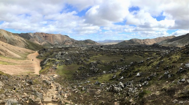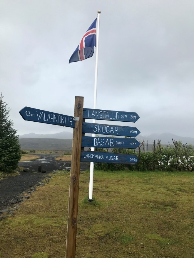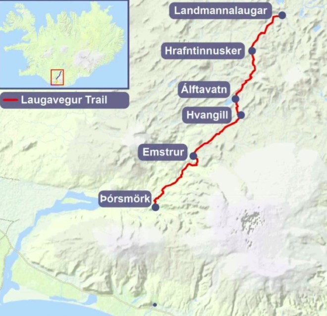 My wife and I are just back from hiking the Lagavegur Trail in Iceland. For readers who don’t know much if anything about this trail (we certainly knew nothing about it until an acquaintance we met on another hike told us about it), let me throw in a map here of the trail; normally, one starts at Landmannalaugar and one hikes southwards to ƥórsmörk.