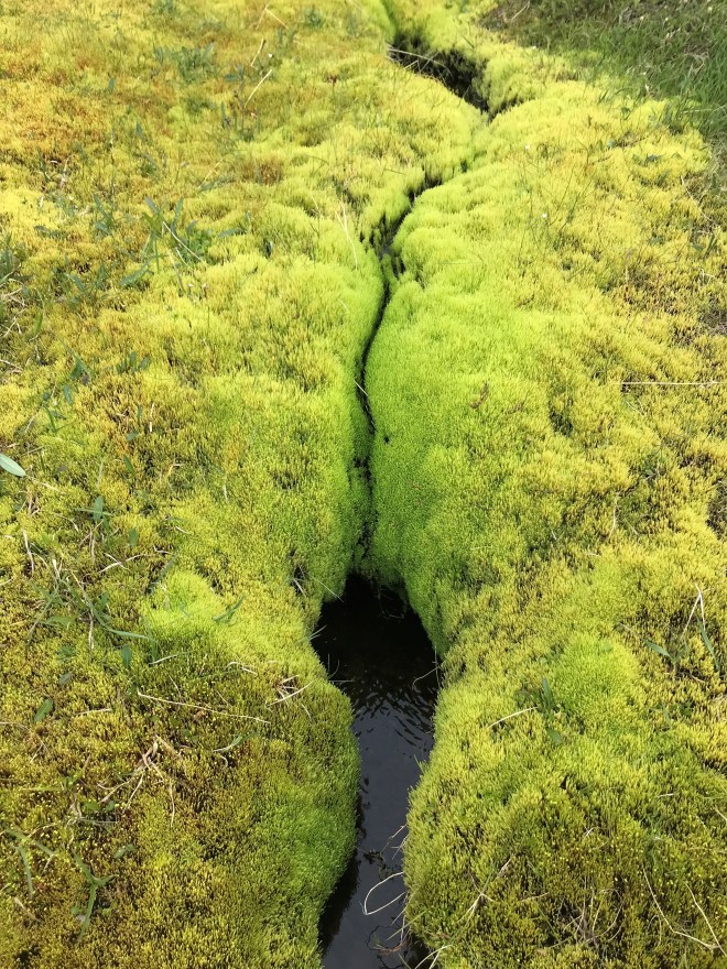 Final look back at last night’s hut (our photo)View of some of the snow fields we’ll be crossing today (our photo)Another view further on (our photo)Bright green moss growing by the mineral-rich waters from hydrothermal vents (our photo)Lake Álftavatn and its plain; tonight’s hut is by the lakeside (our photo)Dark waters, green moss (our photo)Tonight’s huts, seen from the lakeside (our photo)Cotton flowers along a small stream (our photo)That moss again, this time hugging the banks of a small rivulet (our photo)