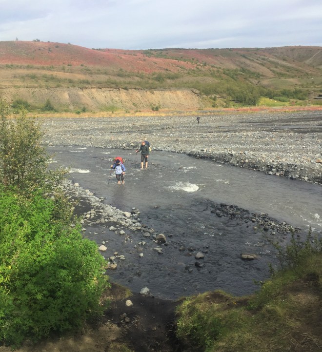 Bye bye EmstrurA canyon to cross … (our photo)… and the bridge to cross it (our photo)We’ll be following this canyon for the rest of our walk today (our photo)This bright red plant began appearing as we lost altitude (our photo)The river has left its canyon and is threading its way to the sea in the distance (our photo)More of the red plant. And we begin to see trees! (small birch trees) (our photo)The last ford of the hike (our photo)We enter a forest, one of the few forests in Iceland (our photo)We have crossed the finishing line! (our photo)