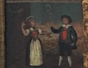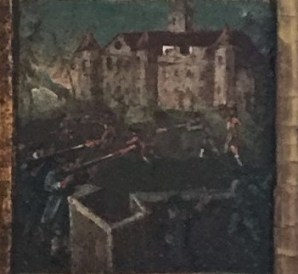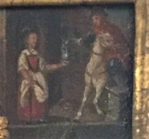 Some time in her teens, she went to work as a servant in the household of the local aristocrats, the Count and Countess of Rottenburg. She was – of course – a very good girl and was scandalized by the fact that the leftover food from the Count’s meals was fed to the pigs when there were lots of townsfolk who went hungry. So with the Count and Countess’s blessing, she collected the leftovers and distributed them to the poor. (From here on, I show, very blown-up, some of the scenes which circle the painting above. They are somewhat dark and fuzzy; if I had known about Notburga beforehand, I would have taken close-ups from the painting itself. Ah well …)