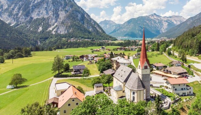 I have told her story somewhat tongue-in-cheek. Quite honestly, it’s difficult for me to see what was so saintly about her life. I find the miracles ascribed to almost akin to conjurors’ tricks. But somethings about her definitely captured the imagination of the rural folk of the Tyrol and contiguous areas. Pilgrimages to that little chapel in Eben started up and became big enough for Maximilian I (whose own mausoleum sits in the church next to the museum) to decide to have a bigger church built in the village at the beginning of the 16th Century. It got a late Baroque makeover a few centuries later. Here is an aerial view of the church, set in the beautiful Tyrolean landscape (it really is a beautiful part of the world).