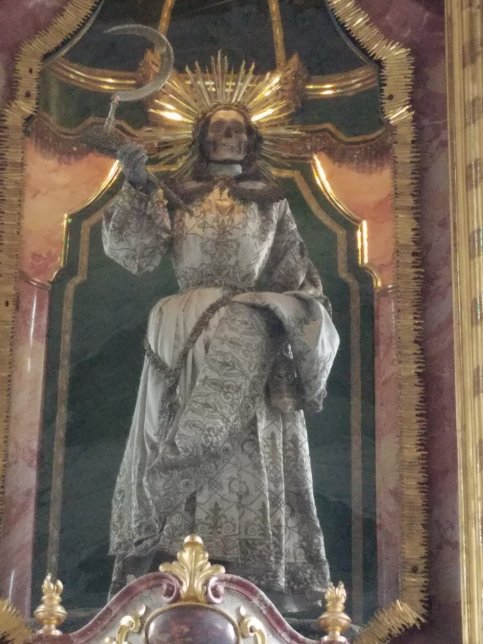 Her skeleton (or someone’s skeleton) was unearthed from the original chapel and, dressed in rich clothing, now rather macabrely presides over the church’s interior.