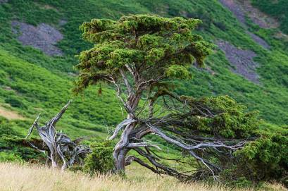 Previous ImageNext Image Gnarled, windshaped juniper trees at sunset in the English Lake District. Source
