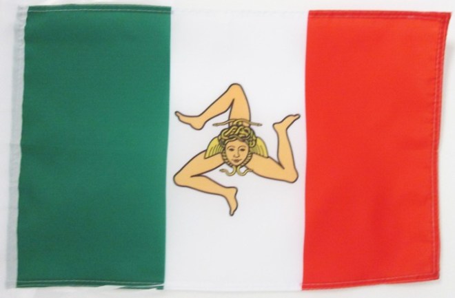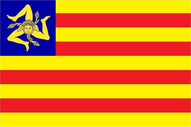 It was made up of the red and yellow colours of Aragon (but also the colours of the communes of Palermo and Corleone, where the revolt started) with a triskeles at its centre (where the Roman ears of wheat had disappeared and the wings brought back, but this time attached to the head).
