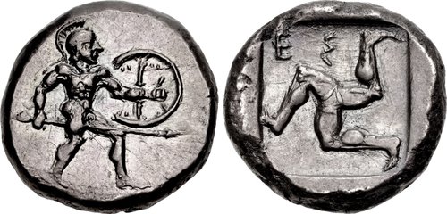 The triskeles was used in varying formats on Greek coins for several centuries thereafter, but it was most closely associated with the coins of Agathocles, Tyrant of Syracuse from 317 BCE, and self-proclaimed king of Sicily from 304 BCE, until his death in 289 BCE. On this coin, it is the main decoration on the reverse side of the coin, because Agathocles adopted it as a personal symbol of his reign.