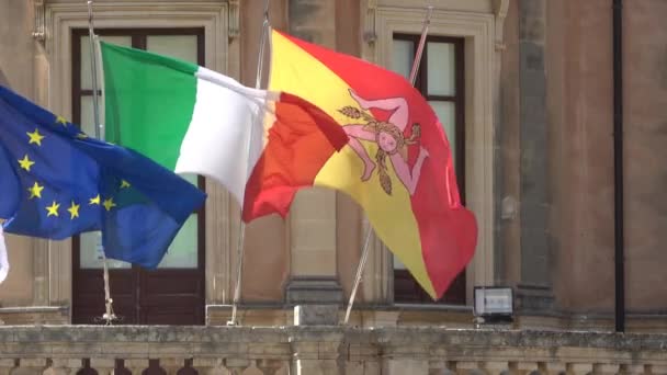 I discovered that it is the official flag of the region of Sicily (which is why I normally saw it flying along with the Italian national flag and the EU flag).
