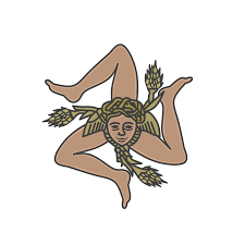 None of Agathocles’s heirs who were still alive when he died managed to succeed him as king of Sicily. In fact, he was formally reviled after his death, with all statues of him throughout Sicily being destroyed. Nevertheless, his triskeles continued to be used as a symbol for the island. After the Romans had turned the island into a province of its Empire, they added three ears of wheat to the Sicilian triskeles, apparently to underline the province’s role as a granary for Rome (and took the wings off the feet).