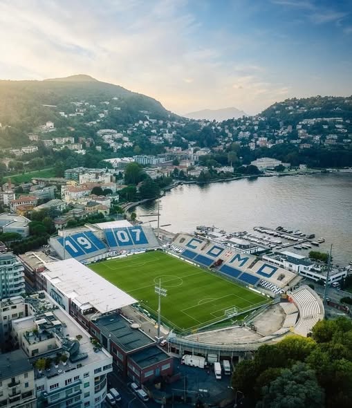 We pass the soccer stadium which is home to the town’s home team, Como 1907 (which looks quite nice in this aerial view, although all we see are the forbidding outer walls).