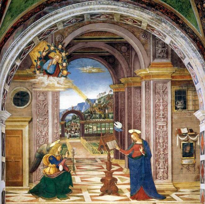 The normal iconography is something along these lines: an angel – obvious because of its wings – on one side, announcing the message, and the Virgin Mary, modestly attired and sitting or standing, reading a book, on the other (I’ve chosen the Annunciation by Pinturicchio as my example).