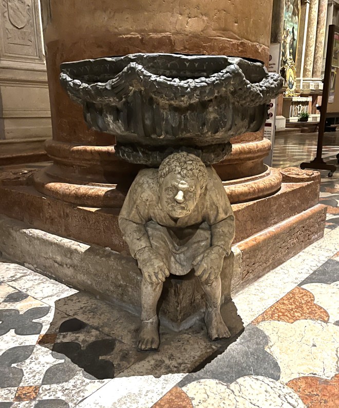 Of the internal details, there were a couple of frescoes and paintings by Worthy Artists, but the one that caught my eye was these two holy water fonts. I’ve never seen any fonts quite like these.
