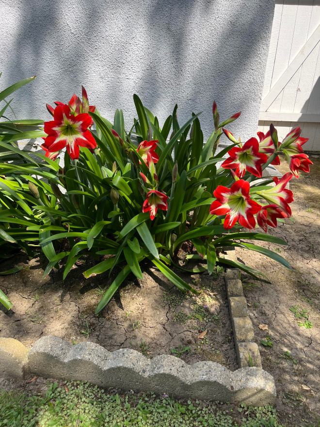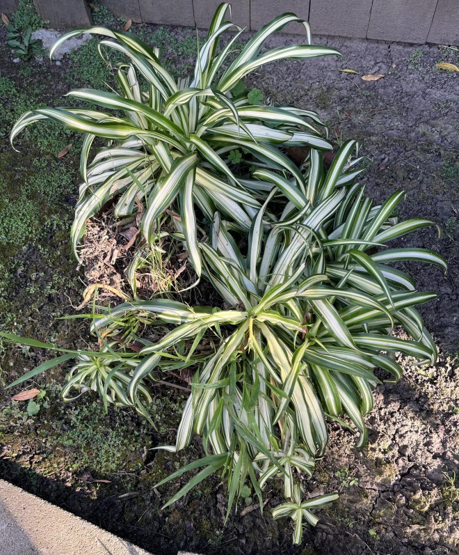 The Caribbean islands have given the garden one plant, the variegated spider-lily. Right now, it is just a mass of unruly leaves. My daughter says the plant has been growing like crazy and she plans to cut it back.